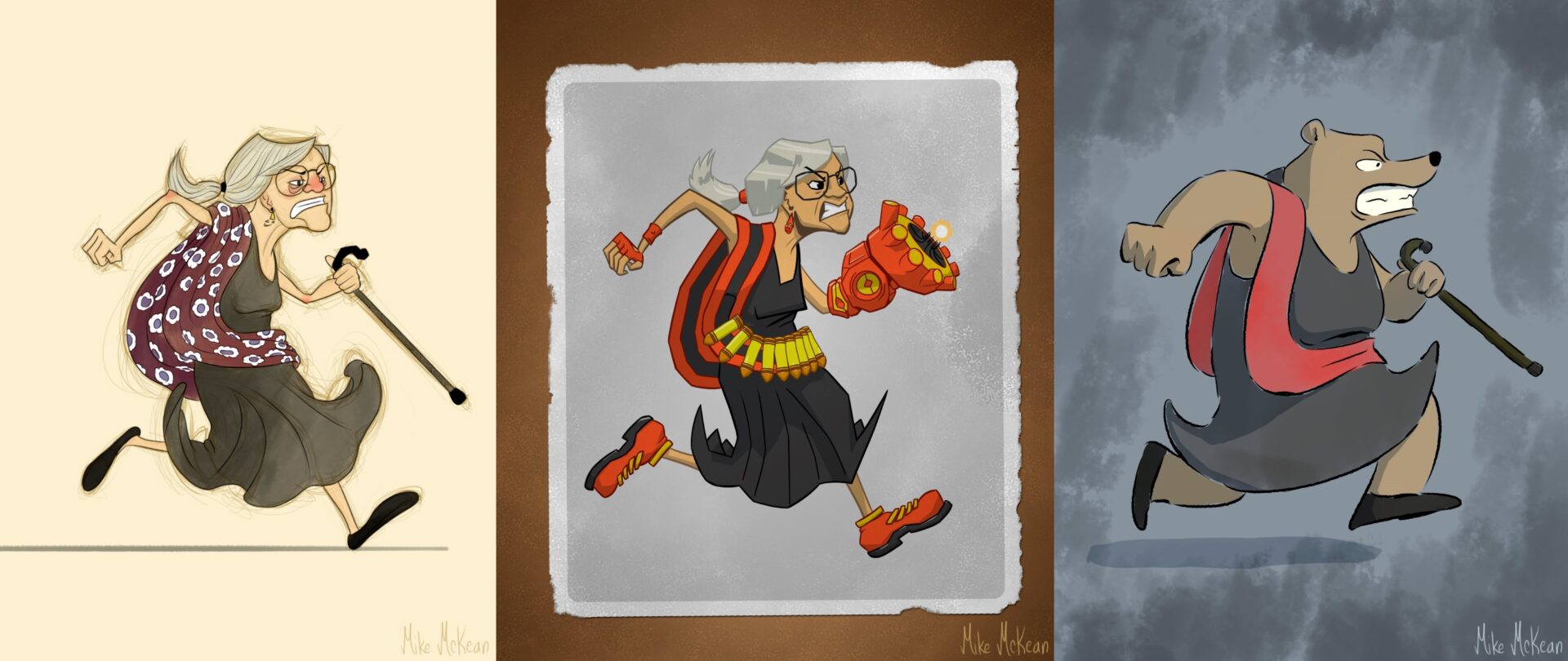An exercise in imitating different styles. From left to right: Nico Marlet (character designer), Creature Box (game studio), and Ernest & Celestine (film).